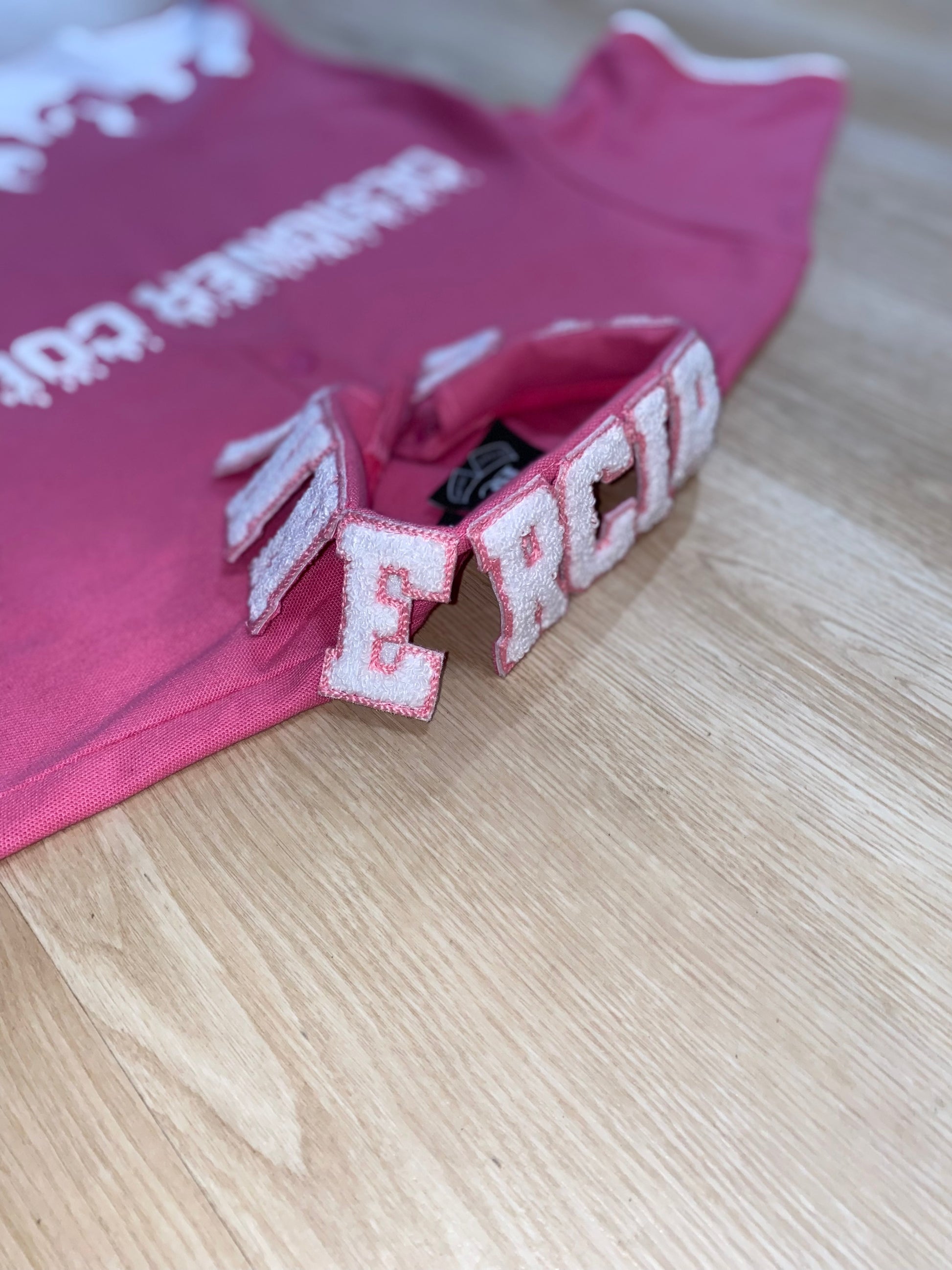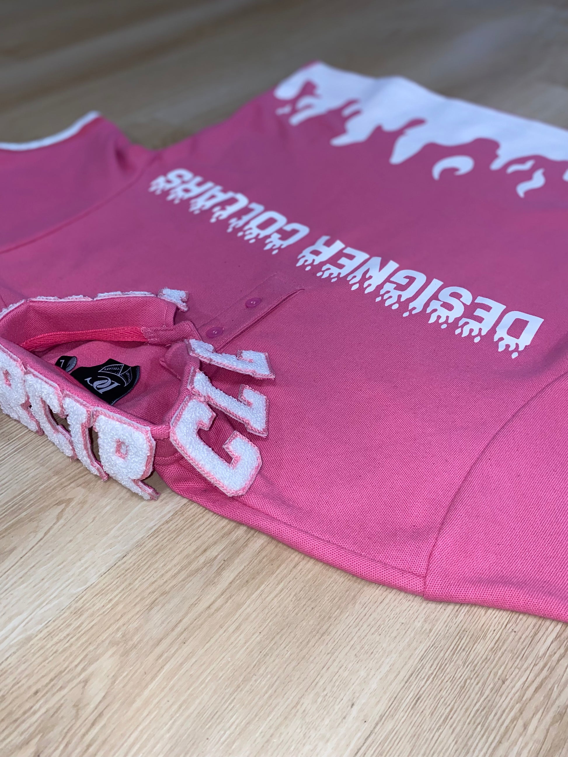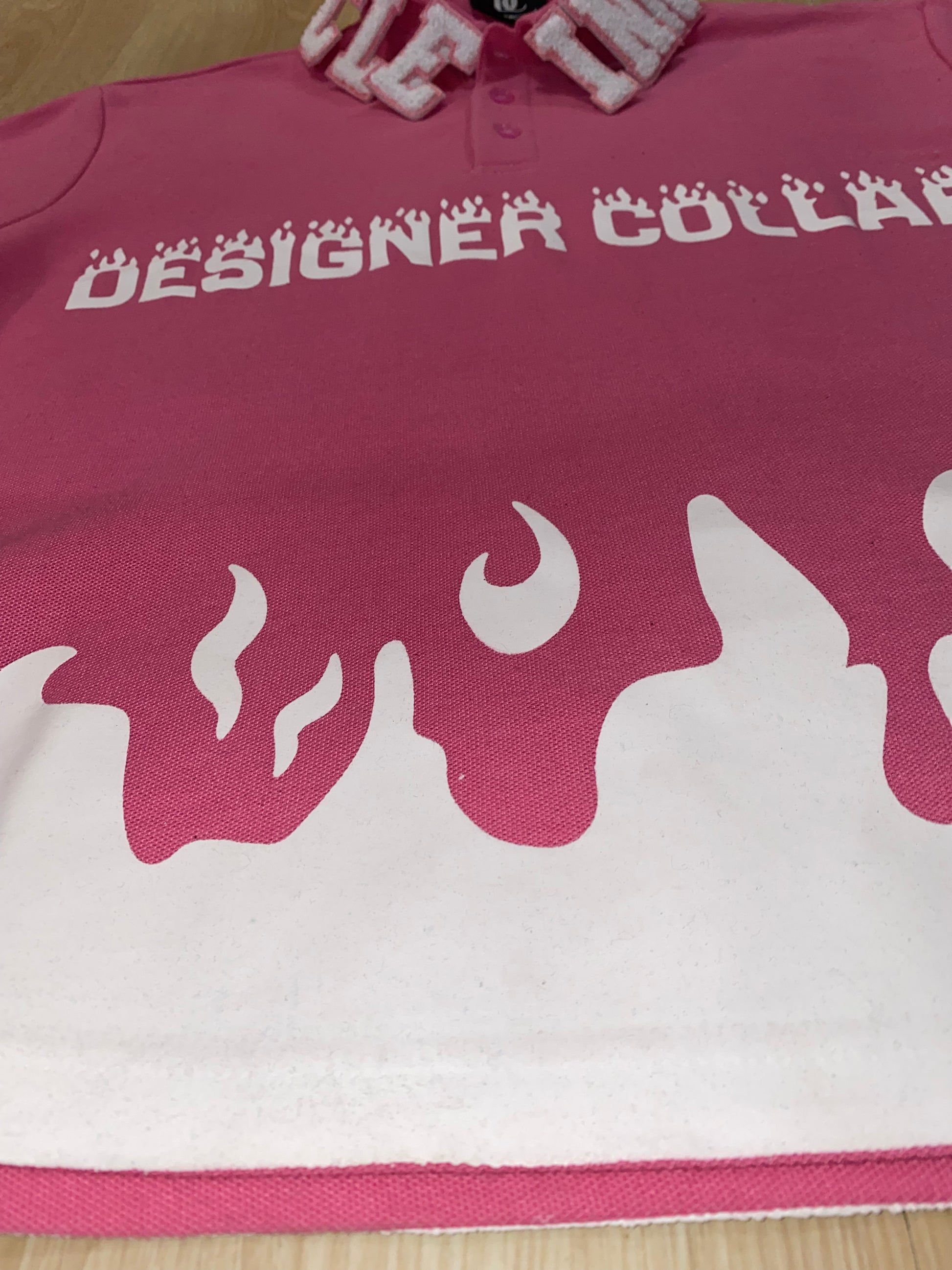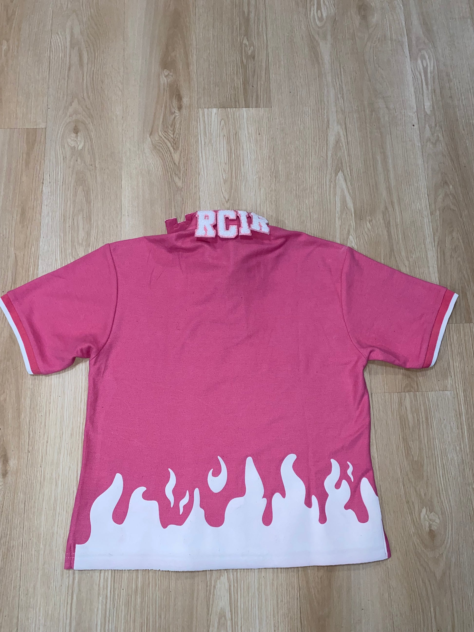 Pink & white Polo with vinyl flames and words across chest 100% cotton